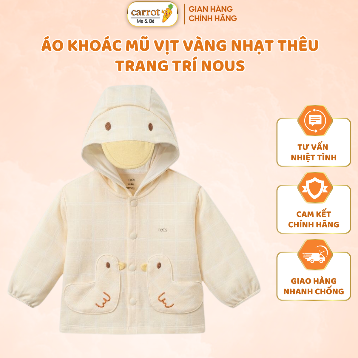 Áo khoác Nous Baby mũ mỏ vịt vàng nhạt là sản phẩm thời trang dễ thương dành cho bé trai và bé gái từ 6 tháng đến 3 tuổi