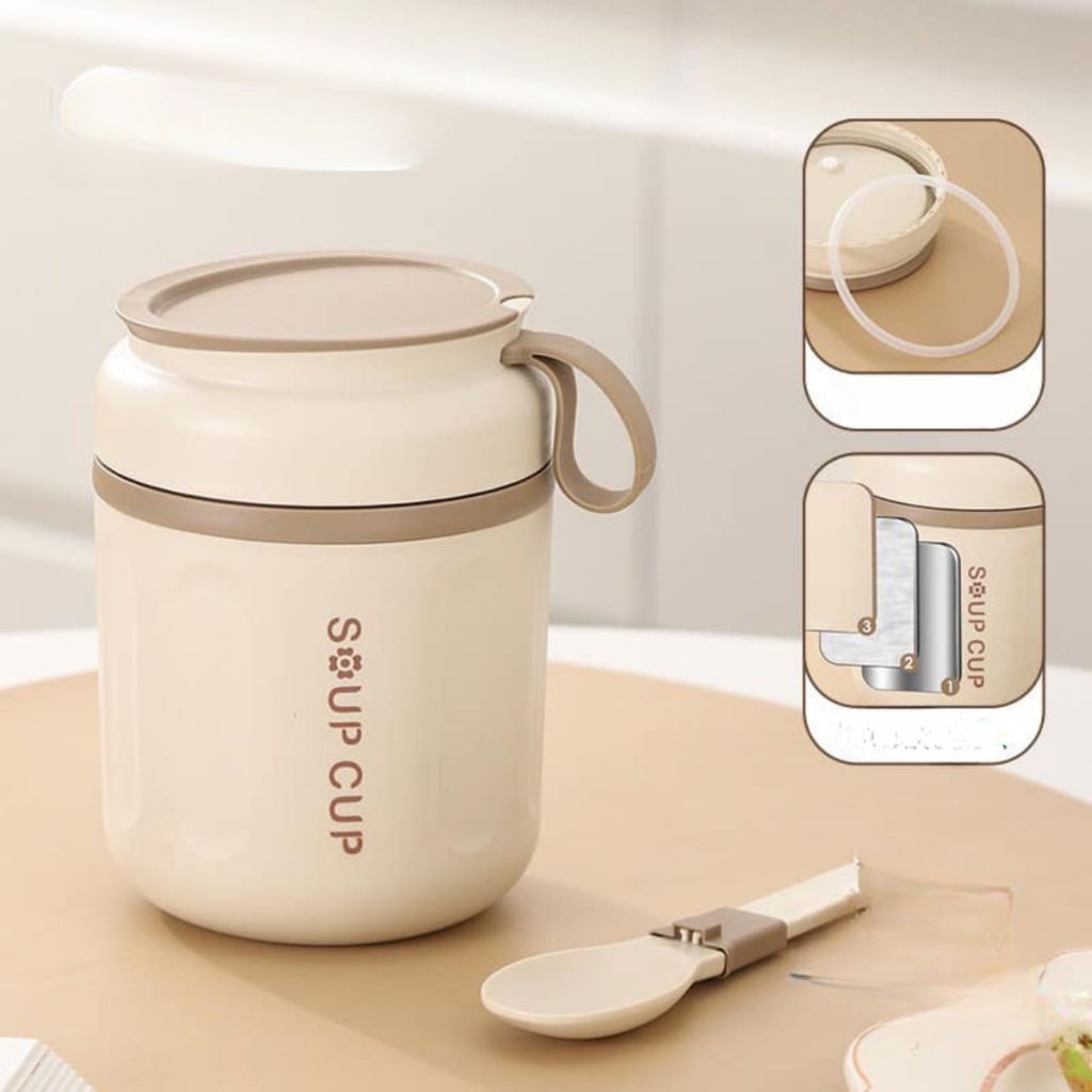- Bình ủ cháo inox Soup Cup, Soup Cup Giữ Nhiệt Inox 304 - Tiện Lợi Với Túi Và Thìa Cốc Đựng Canh, Cháo, Súp Giữ Nhiệt Inox 304 - giải pháp hoàn hảo cho việc giữ ấm và mang theo thực phẩm bất kỳ bạn đến đâu. Với thiết kế thông minh và chất liệu cao cấp, sản phẩm này sẽ làm bạn phải đánh bại gió và thời tiết lạnh trong mỗi bữa ăn.