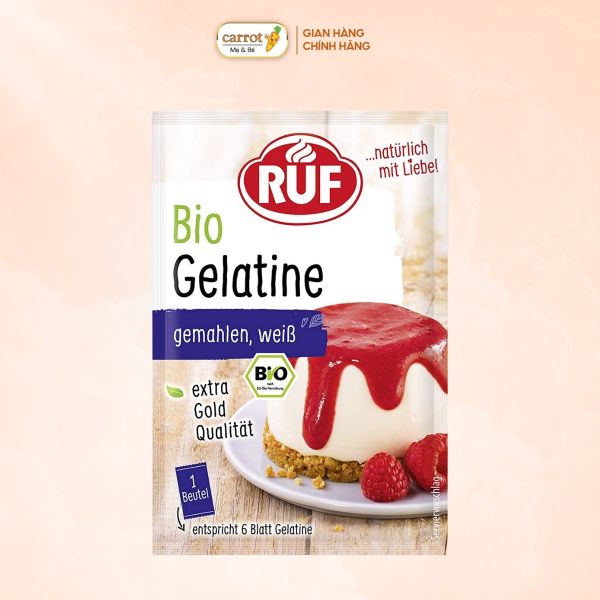 - Gelatin Bio là một sản phẩm gelatin được sản xuất tại Đức, có dạng bột và được đóng gói trong gói 9 gram. Gelatin là một chất làm đặc và đông lạnh phổ biến trong nấu ăn.