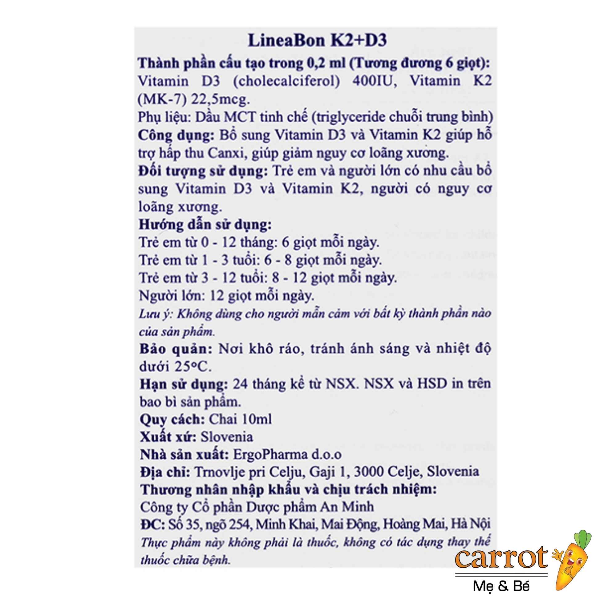 Thành phần D3 K2 Lineabon Bổ Sung Vitamin D3 Cho Trẻ Sơ Sinh