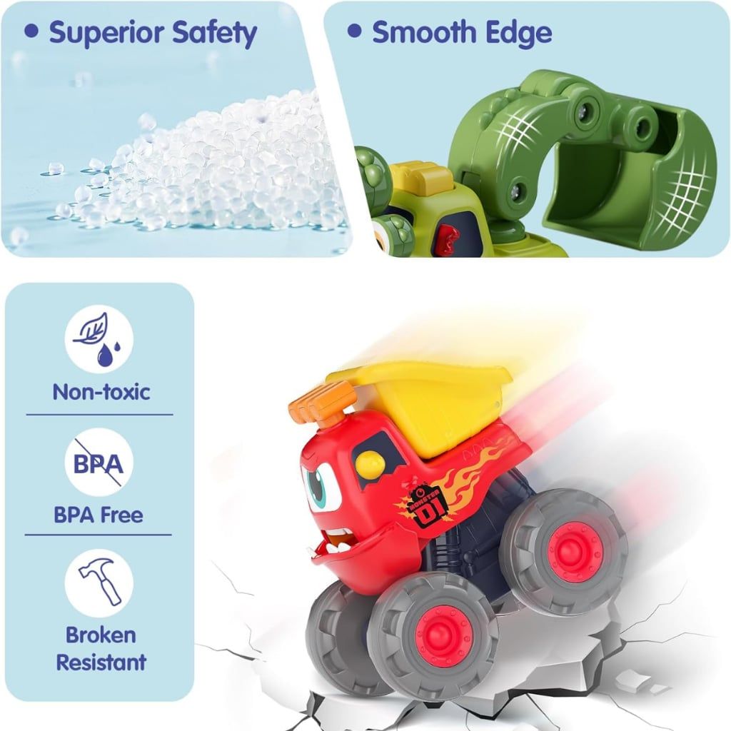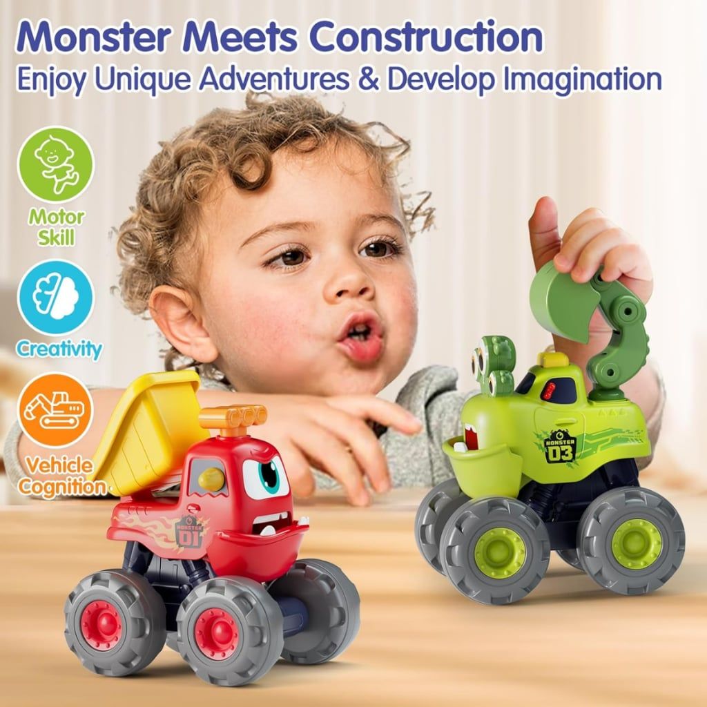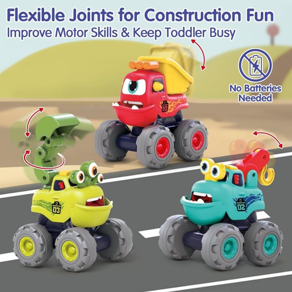 Bộ sản phẩm bao gồm 3 xe tải đồ chơi, bao gồm xe tải ben, xe xúc và xe cẩu. Những chiếc xe đồ chơi này kết hợp thế giới tưởng tượng của quái vật với lĩnh vực xây dựng, thu hút sự chú ý và khơi gợi sự tò mò của bé. Đây là món quà sinh nhật hoàn hảo cho bé trai 1 tuổi và 2 tuổi.