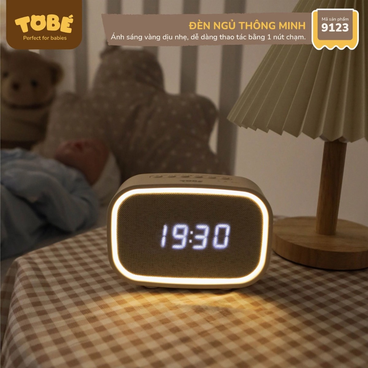 - Đa năng, tiện lợi: Vừa là đèn ngủ dịu nhẹ, vừa là đồng hồ báo thức, lại có thể kết nối Bluetooth để phát nhạc, kể chuyện cho bé nghe. Chiếc Tobe 9123 này còn giúp bố mẹ thư giãn, giảm căng thẳng sau một ngày dài.