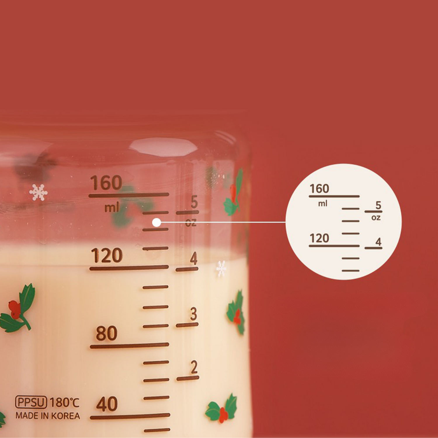 Bình sữa Green Finger 160ml họa tiết Holly sử dụng nhựa PPSU cao cấp không chứa BPA, đạt tiêu chuẩn quốc tế về an toàn. PPSU có khả năng chịu nhiệt đến 180°C, không bám mùi, chống trầy tốt. Núm ti được sản xuất từ silicone y tế cao cấp, mềm mại và thân thiện với bé, chịu nhiệt vượt trội >180°C, đảm bảo an toàn cho sức khỏe răng nướu của trẻ.