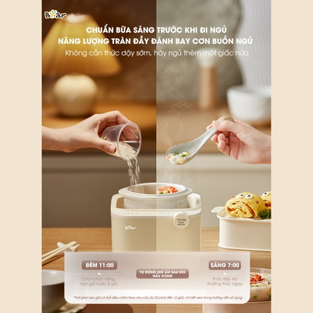 - Hâm nóng và hấp thức ăn: Nồi Bear trang bị chế độ hâm nóng và hấp thức ăn cùng lúc giúp tiết kiệm hiệu quả thời gian nấu nướng.