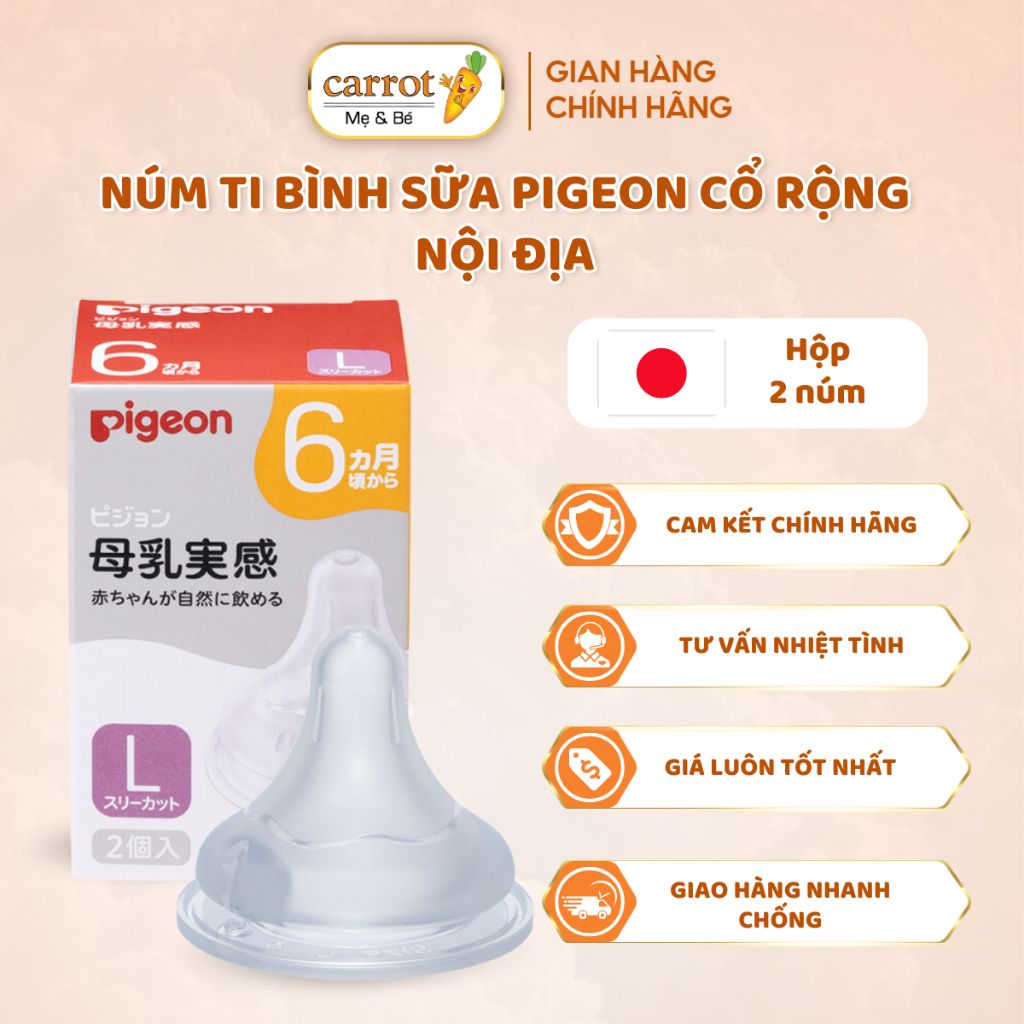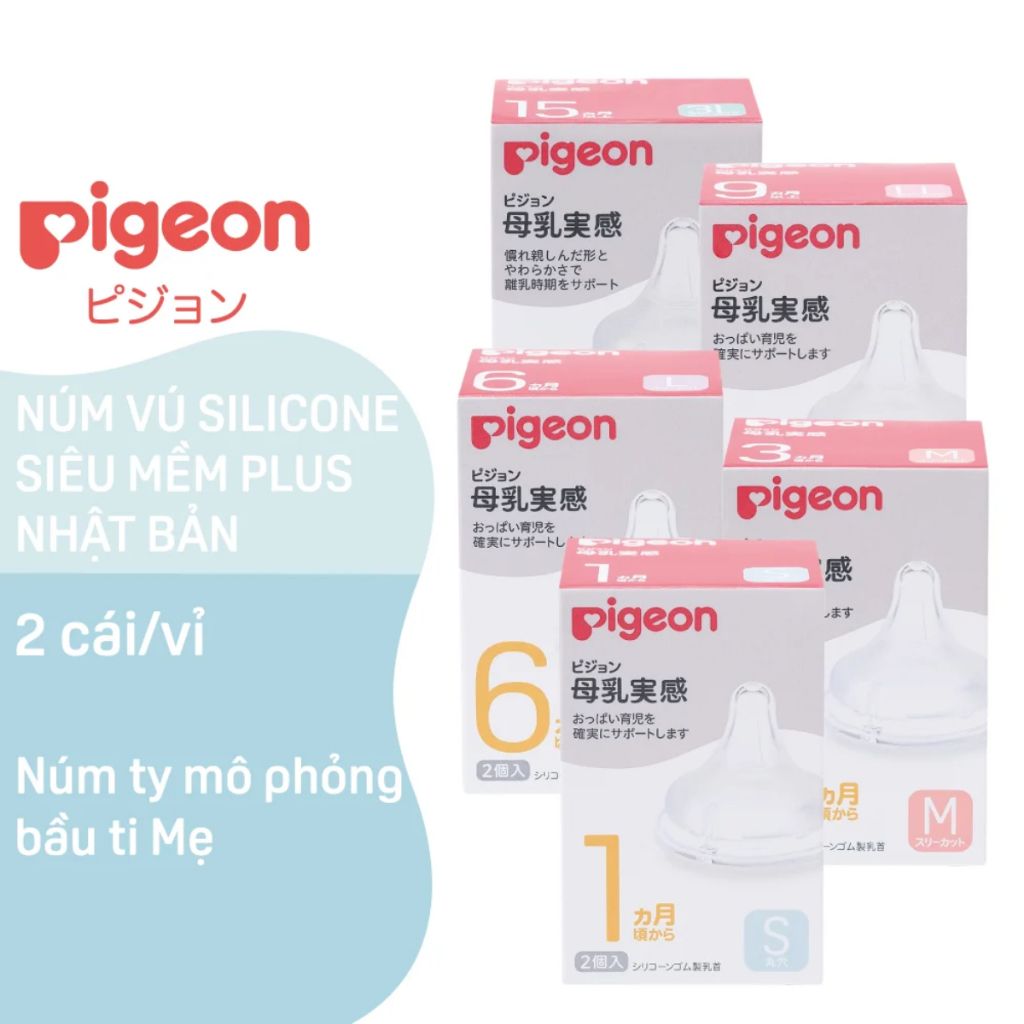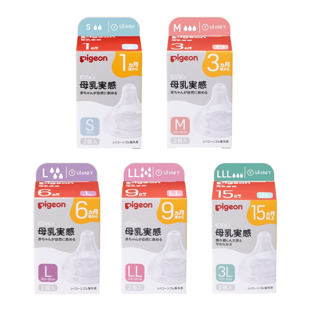 Núm ti Pigeon nội địa cổ rộng về đủ size. Các cỡ núm sẽ khác nhau về kích thước của lỗ ty và độ mềm của núm.