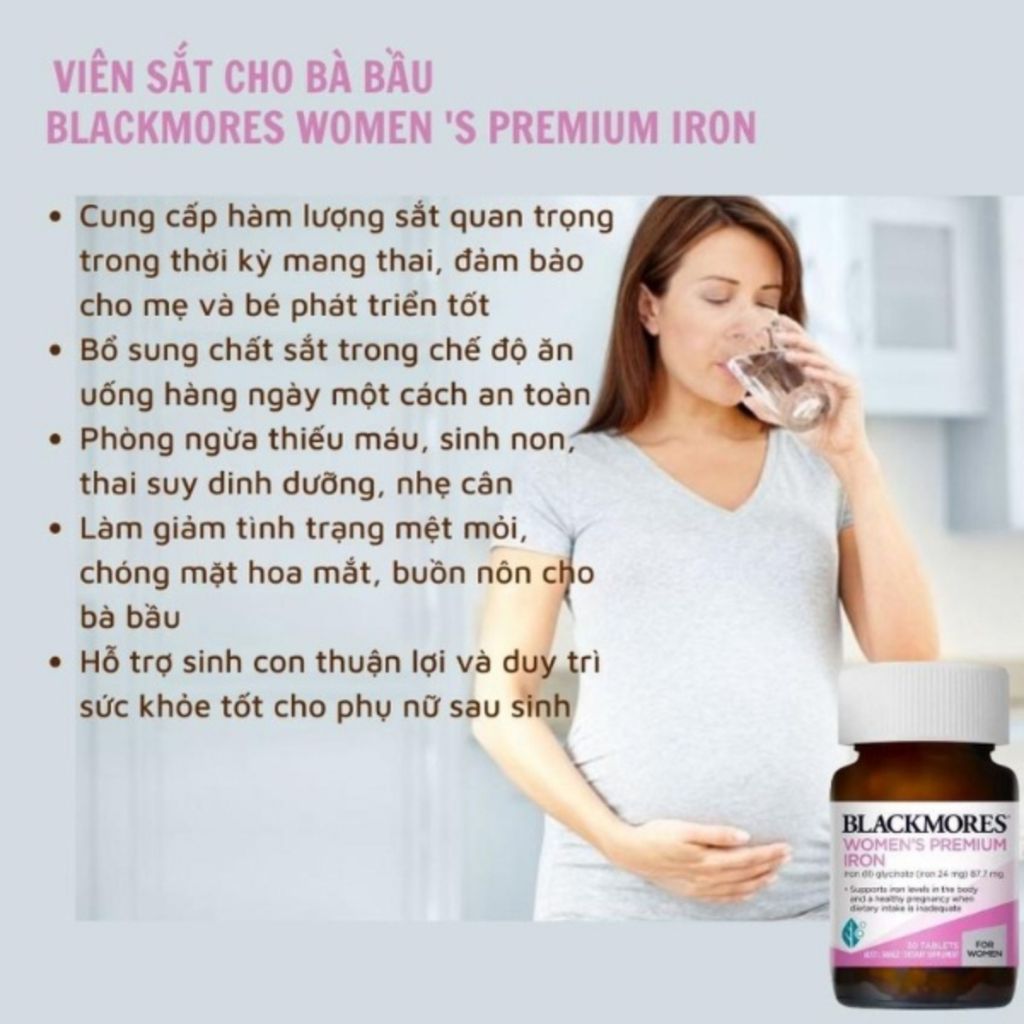 - Viên sắt bầu Blackmores Pregnancy Iron hỗ trợ hạn chế cảm giác buồn nôn hay táo bón.