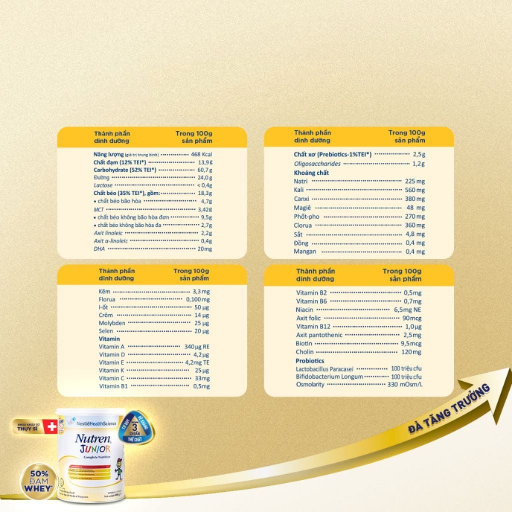 Công thức dinh dưỡng cao năng lượng, đầy đủ và cân đối từ Nestlé Thụy Sĩ, giúp trẻ cải thiện cân nặng hiệu quả và phát triển khỏe mạnh với các thành phần trong sữa:
