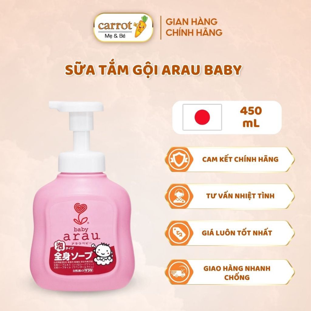 - Sữa tắm Arau Baby Nhật Bản chiết xuất từ thảo mộc, không chứa phụ gia. Đây là một loại nước tắm bọt an toàn dành cho sức khỏe của bé yêu.