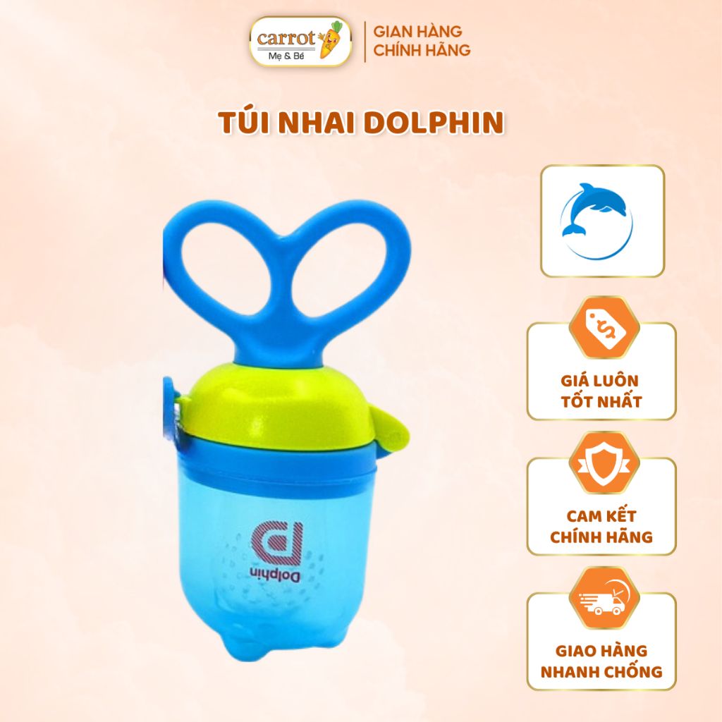 - Túi nhai Dolphin là sản phẩm cần thiết cho bé trong giai đoạn ăn dặm. Sản phẩm sẽ giúp bé tập ăn dặm an toàn và hiệu quả, đồng thời giúp bé phát triển kỹ năng nhai và nuốt.