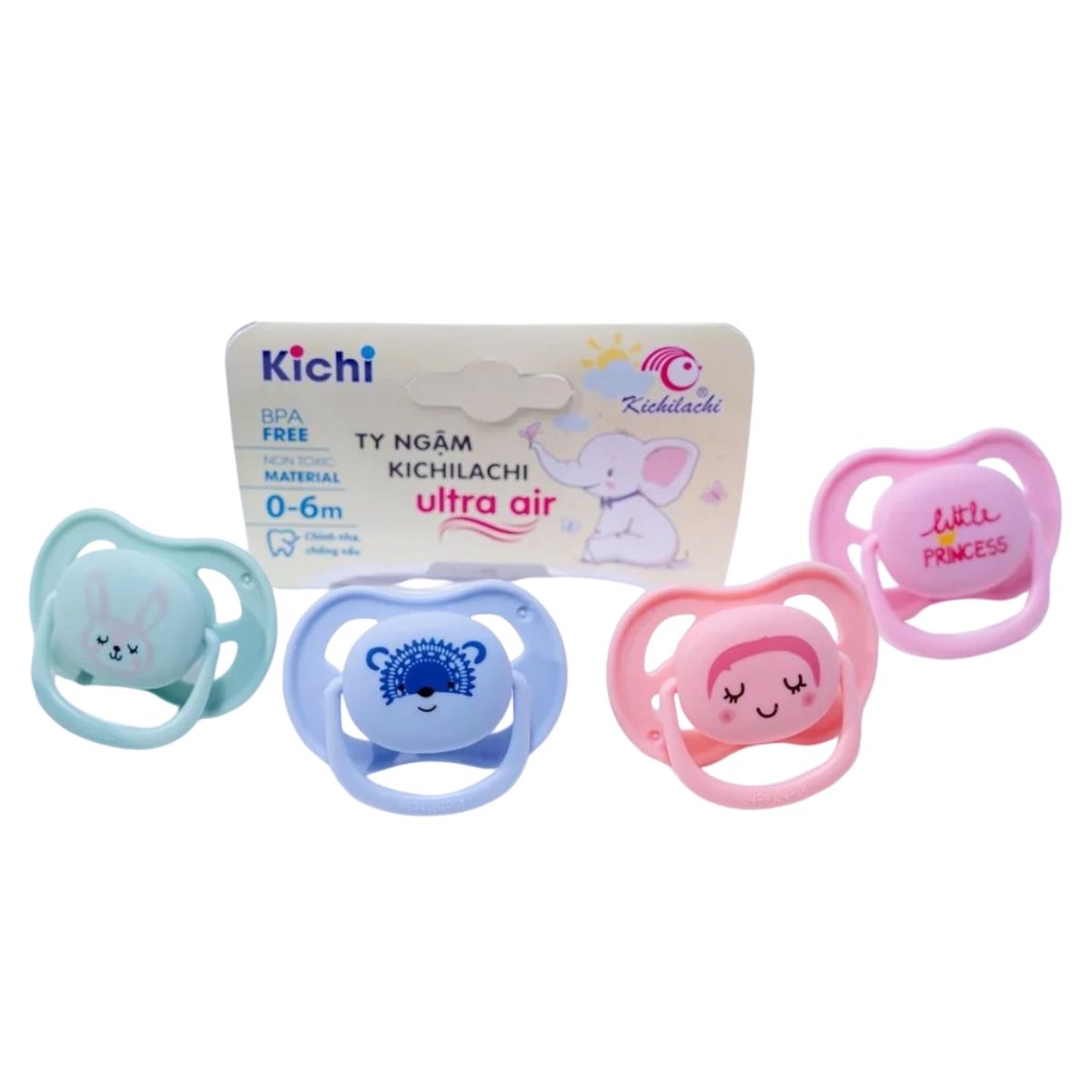 Sản phẩm Sét 2 ti giả, ti ngậm Kichi Ultra Air (không phát sáng) là lựa chọn an toàn và hiện đại cho bé. Được làm từ chất liệu silicon an toàn, sản phẩm này được thiết kế đặc biệt để giúp bé thoải mái hơn khi sử dụng.